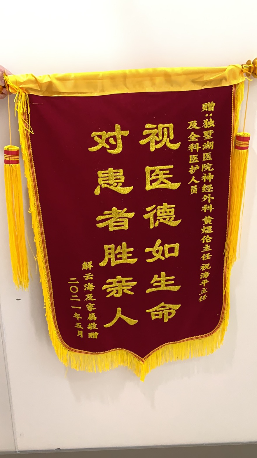 患者解先生及其家属赠送锦旗感谢我院神经外科黄煜伦主任、祝海平主任