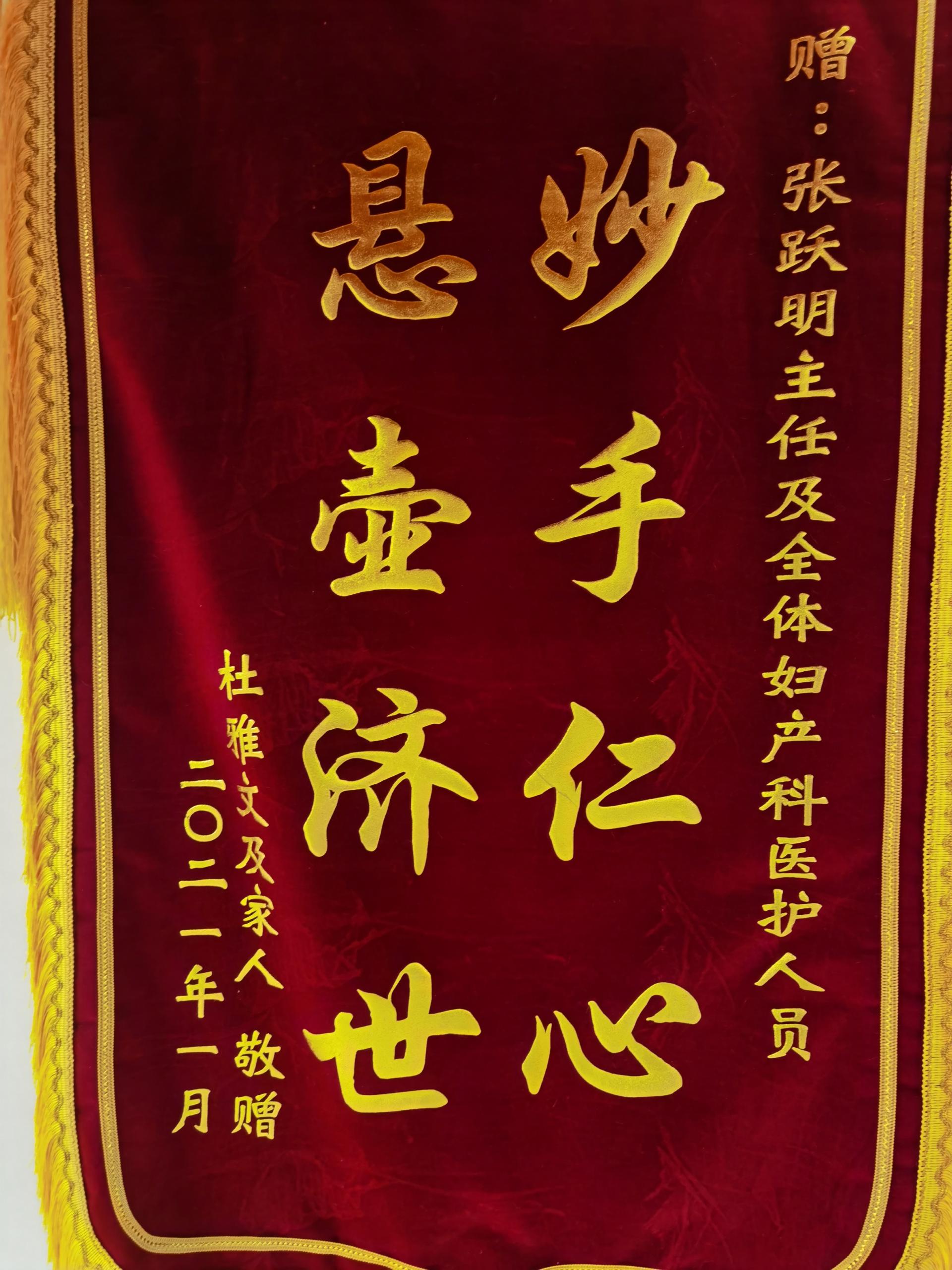 患者杜女士及其家属赠送锦旗感谢我院妇产科张跃明主任及全体医护人员