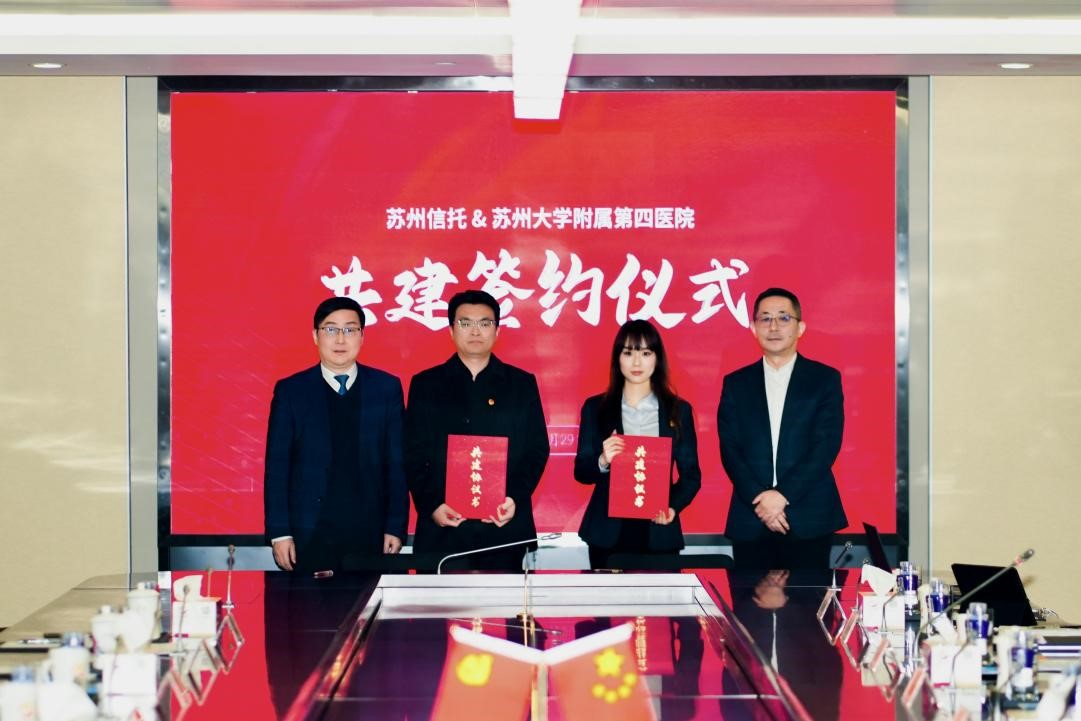 随后,在双方共同见证下,苏州信托有限公司团委副书记殷葭雯与苏大附四院团委书记贾德清签署了共建协议书。