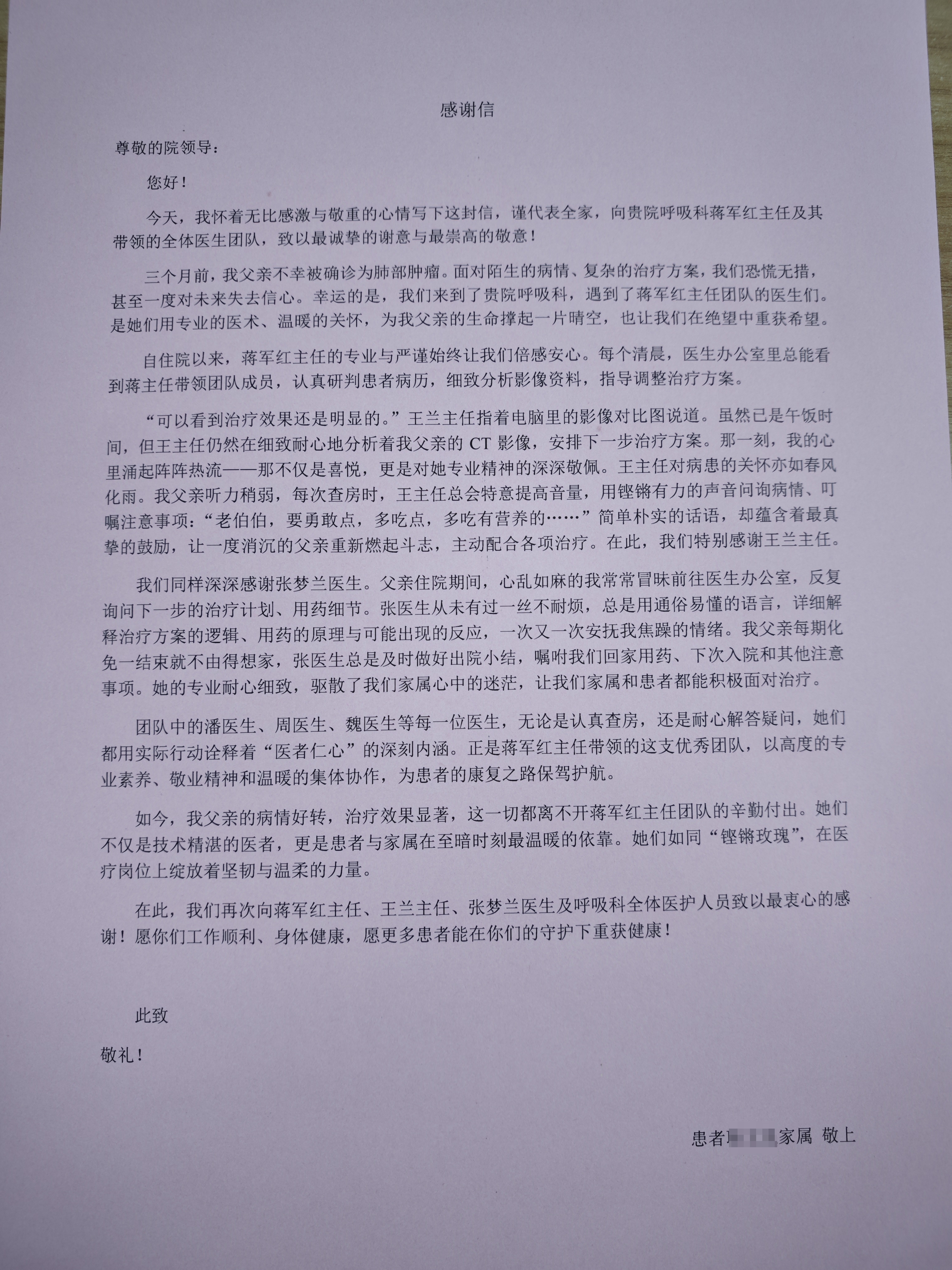 一封致我院呼吸与危重症医学科蒋军红主任及团队的感谢信