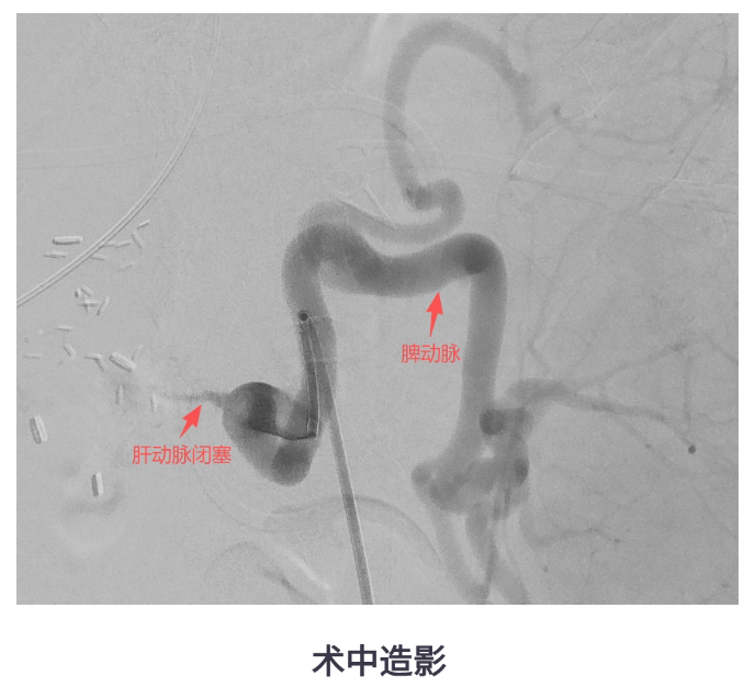 转入我院后,CT显示患者肝脏包膜下积气、肝右叶低密度影,提示脓肿复发,同时存在门静脉高压、脾大、肝动脉狭窄等复杂情况。医疗团队决定为她实施经导管脾动脉栓塞术(SAE),并同期进行肝动脉造影和压力测量。